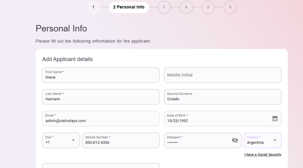 In the next screen complete your personal information. If you do not have a Social Security Number, click on the option "I don't have a social security number" and add your passport information.